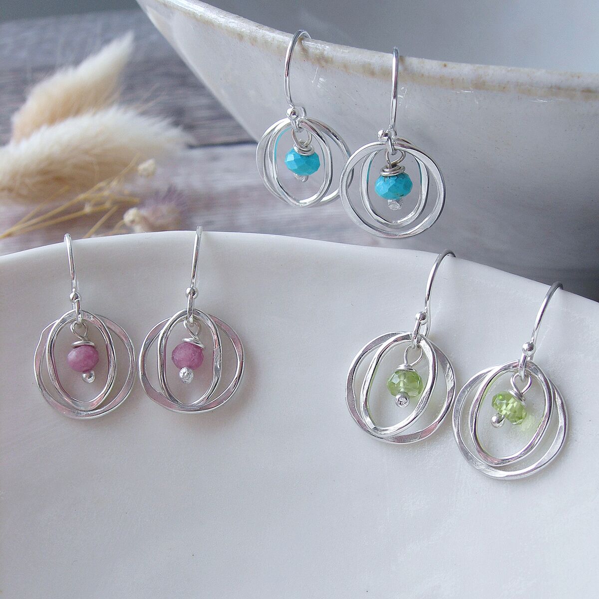 Choose one of the birthstones of the 12 months of the year to create personalised gemstone earrings. The semi-precious gemstone birthstones have detailed faceted cuts and are carefully hand wrapped in silver. A hand shaped oval and circle with hammered surface create the swirl design.